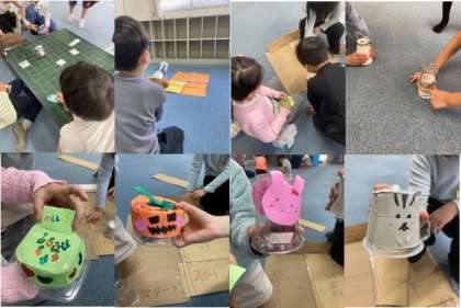 2年生が自分たちで作ったおもちゃで遊んでいます。板を使って転がしたり、的を作って得点を競いあったり、おもちゃも工夫していましたが、遊び方にもいろいろな工夫が見られました。