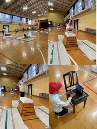 4年生が体育の「跳び箱」の学習で台上前転に挑戦しています。自分の目標を決めて、それぞれの高さで練習しました。また学習用端末を使って、自分のフォームを確認しました。