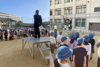 新型コロナウイルス感染症の感染対策、および熱中症対策の観点から、運動場での集会は見合わせていましたがTeamsでの全校集会を実施していましたが、気候が涼しくなってきたこともあり、今年度初めて、運動場での「昼のつどい」を実施しました。1・2・3年生と4・5・6年生を分けての実施となりましたが、多くの子どもが、しっかりと話を聞くことができていました。