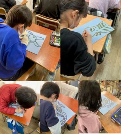 5年生が干支の版画を制作しています。板に下絵を描いて、印刷したときに濃淡がつくように、彫り進めていきます。怪我をしないように、安全に気をつけて制作しています。
