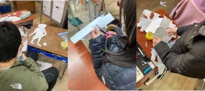 多くの学年で版画に取り組んでいますが、3年生では、自分の体のパーツを一つひとつ紙で作り、それを組み合わせて貼ることで、動きのある紙版画づくりに挑戦しています。紙を切って、どう組み合わせれば、自分が考えている動きになるかを考えながら貼っていました。