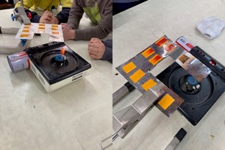 4年生は理科で金属のあたたまり方の学習をしています。温度が変わると色が変わる示温シールを貼った金属の橋を温めて、温度の変化を調べる実験をしました。示温シールの色が変わり始めると、火の近いところから徐々に温度が上がっていく様子を観察することができました。