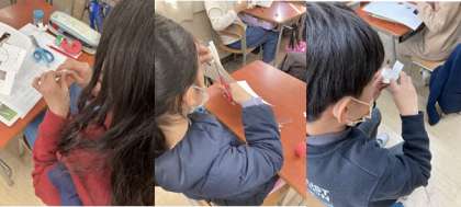 4年生は算数科で展開図を作っています。今日はいろいろな展開図を作って、いろいろな立体を作っていました。