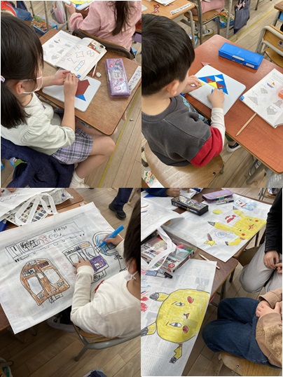 3月8日の5時間目、1年生では算数で「かたちづくり」の学習をしていました。算数セットの色板を使っていろいろな形を作っていました。また他の学級では作品バックに好きな絵を描いていました。