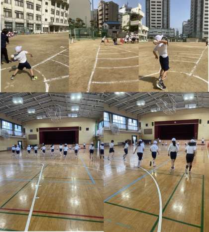 ソフトボール投げ・20mシャトルラン・50m走など、全学年で「新体力テスト」に取り組んでいます。1年生も、ソフトボールを精いっぱいに投げていました。