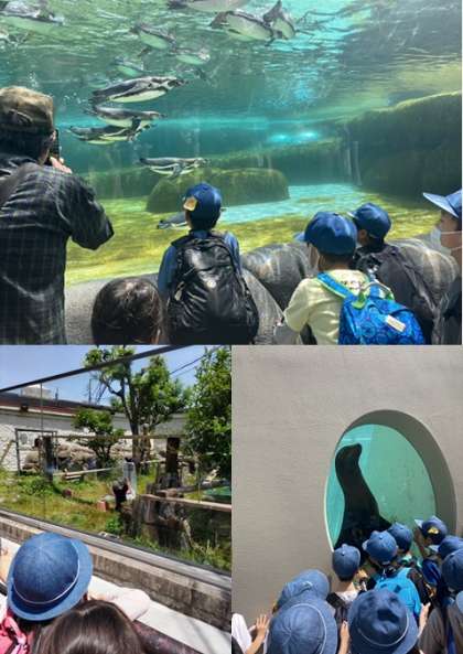 とても天気のよかった5月10日、2年生が校外学習で天王寺動物園へ行きました。新しくできたエリアも見ることができ、水の中を泳ぐペンギンやアシカに大喜びでした。友だちとお弁当を食べたあとも、キリンやオオカミなどの動物を見てまわり、楽しい校外学習になりました。