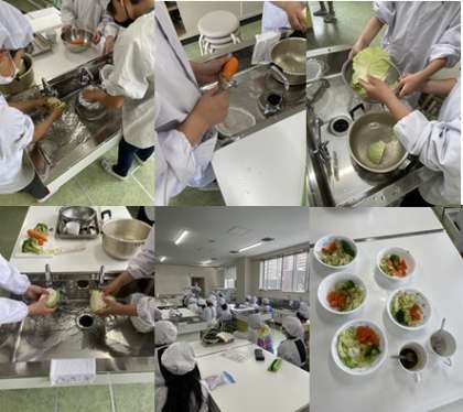 5年生は家庭科で調理実習初体験です。調理するメニューは「カラフルゆで野菜サラダ」です。学級ごとに家庭科室で、切る、ゆでるなどの調理を行いました。みんなおいしくできたようです。