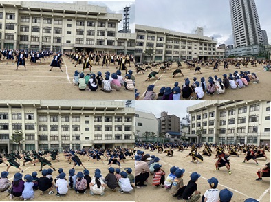 体育発表会は1・3・5年、2・4・6年に分けて実施するため、体育発表会当日は1年生は6年生の演技を見ることができません。なので、今日は1年生が6年生に「南中ソーラン」の演技を見学させてもらいました。6年生は当日と同じように衣装を身に着けて全力で踊りました。それを見た1年生からは「すごく上手だ」という声がたくさん聞こえていました。