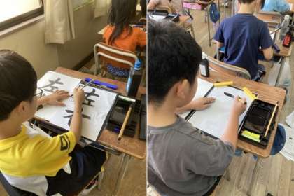 4年生が毛筆習字の学習で「左右」と書いていました。とめやはらい、文字の形を意識しながら、丁寧に書いていました。