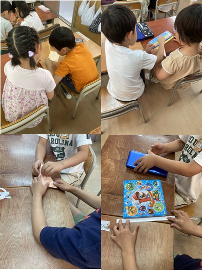 1年生は算数で長さを比べる学習をしています。今日は紙テープを使いながら、色鉛筆のケースの縦と横、どちらが長いのかを調べました。ペアで協力しながら、テープを色鉛筆のケースに合わせ、鉛筆でチェックするなどして長さを調べていました。