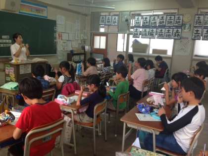 4年生で歯の指導とフッ化物塗布を行いました。歯科衛生士さんから、むし歯の原因や、むし歯を予防するための生活習慣についての話を聞いた後、全員で歯みがきをして、保健室で歯科校医の森下先生にフッ化物塗布をしていただきました。