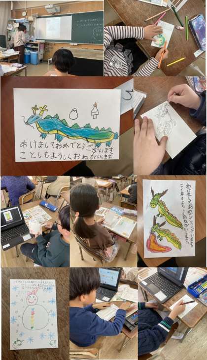 1・2年生が年賀状を書いていました。来年の干支である龍の絵を描いている子、冬にちなんだ絵を描いている子、様々ですが、みんな一生懸命かいていました。