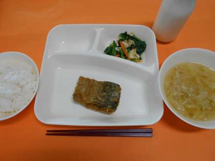 インド風さばのサクサクあげ、すまし汁、こまつなとあげの煮もの、ごはん、牛乳
