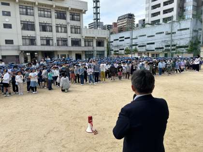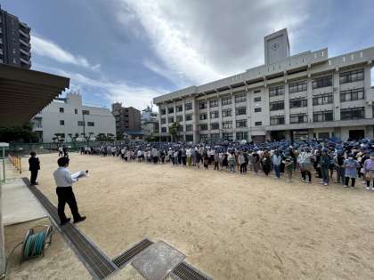 24日(水)に避難訓練をしました。今回は、理科室で火災が起こったと想定して、運動場に避難しました。1000人近い児童が、落ち着いて避難することができました。
