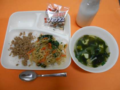 ビビンバ、わかめスープ、アーモンドフィッシュ、牛乳