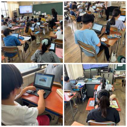 5年生の国語科「地域のみりょくを伝えよう」の学習の様子です。大阪の魅力についてインターネットで調べ、Wordにまとめています。調べて分かったこと(事実)と自分の考えを分けて書くように気を付けました。