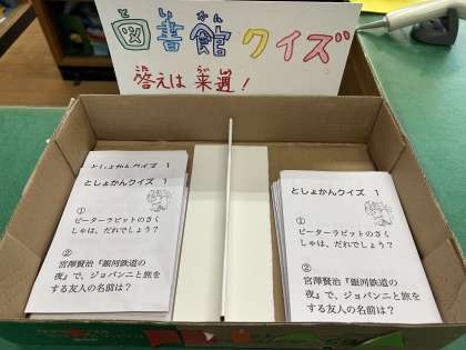 図書委員会の取り組みとして、図書館クイズに取り組んでいます。五条小学校の子どもたちがもっと本に親しみがもてるよう、図書委員の児童が考えました。図書室においてありますので、ぜひ取り組んでみてください。