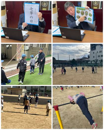 1月9日(木)3学期の始業式を実施しました。校長先生からは、まとめの学期となる3学期の大切さについてのお話の他、七草のお話や満月のお話などがありました。この日はとても寒い日でしたが、多くの子が元気よく外で遊んでいました。また、玄関の掲示物は4年生が作った、巳年である新年に関連した掲示物になっています。