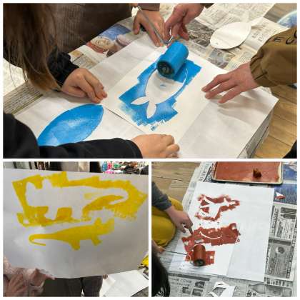 図画工作科の学習の様子です。2年生は、好きな形の型紙を作り、その形を版のようにして画用紙にうつす活動をしています。今回は動物の形を描いて版にして、絵の具をつけたローラーで形をうつしました。配置の仕方や色遣いを楽しみながら活動しました。