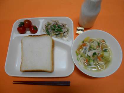 五目うどん、豚肉と野菜のいためもの、プチトマト、食パン、バター(キューブ)、牛乳