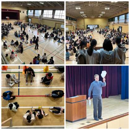 色別集会の様子です。朝、なかよし班ごとに講堂に集まり、集会委員会の児童が司会でゲームをしています。班ごとに輪になって座り、6年生が優しく声をかけて進めていました。その後は外国語指導担当が壇上に上がり、英語のじゃんけんを楽しみました。
