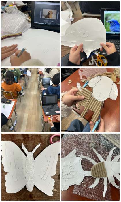 図画工作科の学習の様子です。3年生は紙版画に挑戦しています。版の材料として、画用紙だけでなく、段ボールや緩衝材なども使って表現しています。この日は、タブレットを見ながら下絵を描き、材料を切り貼りして版を作り始めていました。どの部分にどの素材を使うのか、素材の特徴を意識しながら工夫して作っていました。完成が楽しみです。