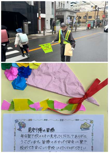本校では児童の登下校の安全を守るために、地域見守り隊の方々が通学路に立ってくださっています。いつも児童を見守っていただき、本当にありがとうございます。