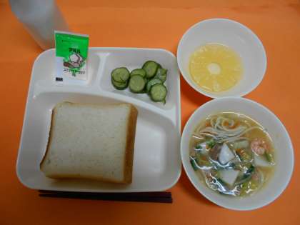 チャンポン、中華あえ、パインアップル(缶)、食パン、ソフトマーガリン、牛乳