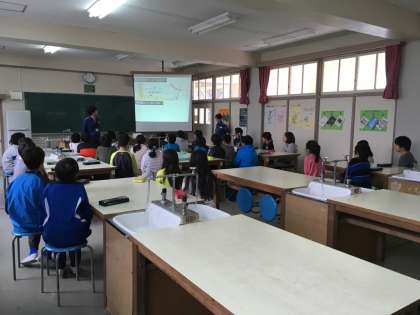 2月9日に関西電力の職員の方々に来ていただいて、電気をテーマに特別授業を行っていただきました。どうやって電気はできているのか、どんなときに多く電気が使われているのかなどを学びました。そして実際に手回し発電機で電気を作る体験をしました。グループで協力して一生懸命発電機を回す姿にクラスみんなが笑顔になりました。最後に火力発電の仕組みを説明いただき、水蒸気でタービンを回す発電機を見ました。子どもたちは水蒸気の力にとても驚いている様子で、電気に興味を持ったようでした。