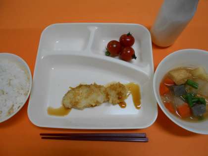 まだらのからあげ、じゃがいもと野菜の煮もの、プチトマト、ごはん、牛乳