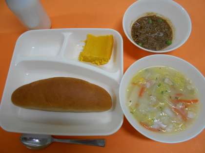 牛肉のデミグラスソース煮、コーンスープ、かぼちゃのプリン、黒糖パン、牛乳