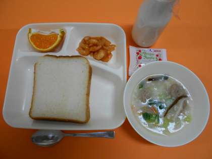 えびのチリソースいため、中華がゆ、デコポン、食パン、りんごジャム、牛乳