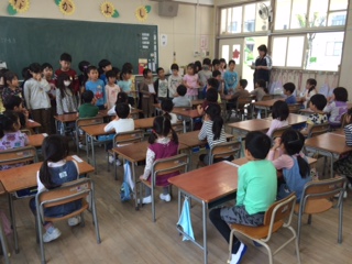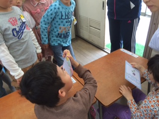 案内する1年生に私たちが昨年育てたアサガオのたねをプレゼントしました。