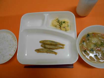 きびなごてんぷら、みそ汁、えんどうの卵とじ、ごはん、牛乳