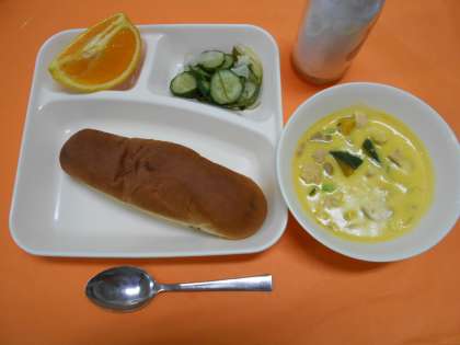 かぼちゃのクリームシチュー、ミックス海そうのサラダ、オレンジ、レーズンパン、牛乳