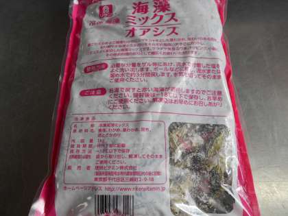 ミックス海そうのサラダに使用しているミックス海そうは、こんぶ、わかめ、茎わかめ、赤とさかのりが入ったものです。キャベツ、きゅうりとともに手作りドレッシングであえました。