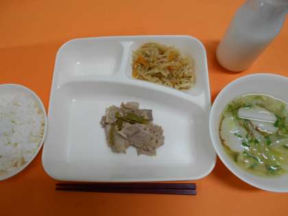豚肉の梅風味焼き、すまし汁、切り干しだいこんのいため煮、ごはん、牛乳