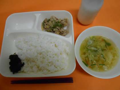 豚肉のごまみそ焼き、すまし汁、のりのつくだ煮、ごはん、牛乳