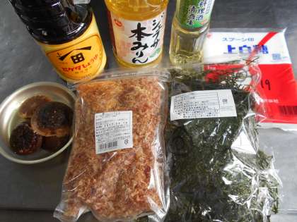 材料は、かつおぶし(砕片)、干ししいたけ、きざみのりです。作り方は、すまし汁の一部としてとっただしに砂糖、料理酒、みりん、こい口しょうゆを入れて煮た中に、荒みじん切りにしたしいたけ加えて煮ます。煮上がれば、かつおぶし、きざみのりも加えてコトコトと煮詰めました。