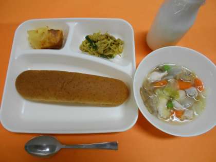 鶏肉と野菜のスープ煮、カレーソテー、りんごのクラフティ、ライ麦パン、牛乳