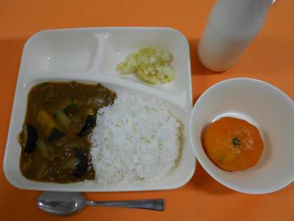 旬の夏野菜であるかぼちゃ、なす、トマト(缶)、ピーマンを使用したカレーライスです。デザートには、冷凍みかんがつきました。