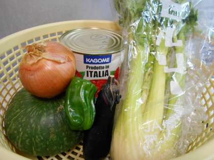 2枚目が夏野菜のカレーライスに使用した野菜です。かぼちゃ、たまねぎ、なす、トマト(缶)、ピーマンとセロリーです。