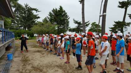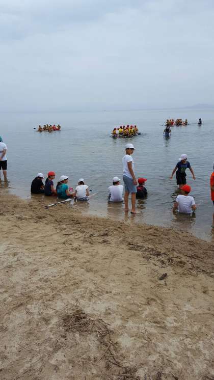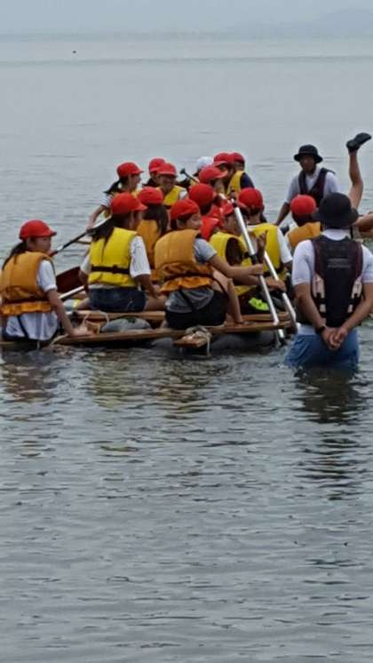 午前のプログラムです。いかだ活動の様子です。自分たちで組み立てたいかだを琵琶湖に浮かべがんばって漕いでいます。
