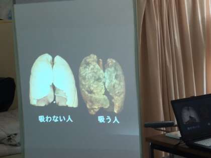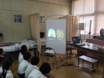 タバコの仕組みや害についてのDVDを見た後、パワーポイントで日本と世界の喫煙防止に向けた取り組みについて話を聞きました。