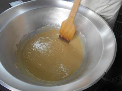 給食のハヤシライスは、小麦粉とサラダ油でブラウンルウを作ったものを加えて煮込みます。