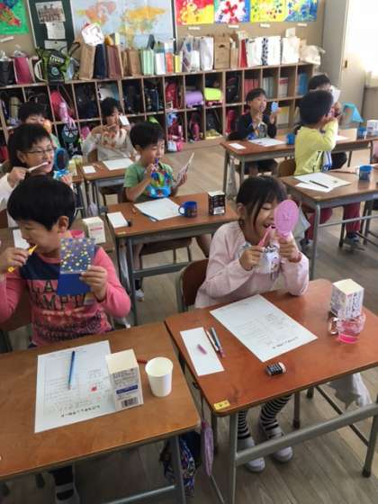 今日の朝みがいてきたはずの歯を、歯垢染色液で染めてみると…。赤く染まった歯垢に2年生の児童は驚いた様子でした。その後、上手な歯のみがき方を教えてもらってもう一度みがき、歯垢が残っていないことを確認しました。