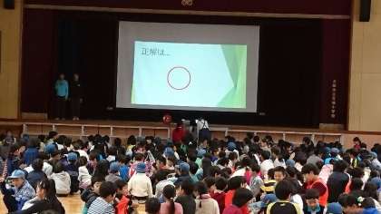 児童集会で、新聞委員会が○×クイズをしました。普段の活動の様子や五条小学校の出来事をクイズにしました。なかよし班で楽しく考え、答えをだしていました。