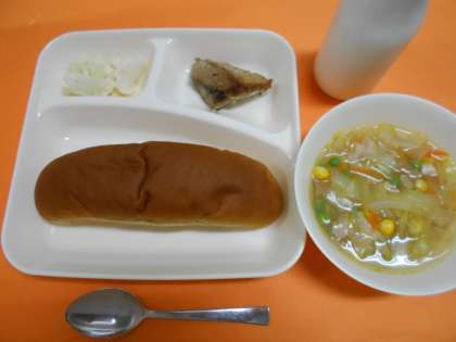 かつおのガーリックマヨネーズ焼き、マカロニと野菜のスープ、カリフラワーのサラダ、黒糖パン、牛乳