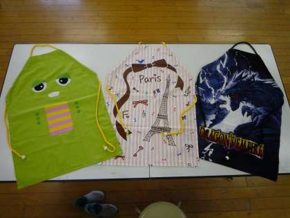 友だちと教え合い、できあがったエプロン…身につけてみる子どもたちの姿には、自分で製作した喜びがあらわれていました。