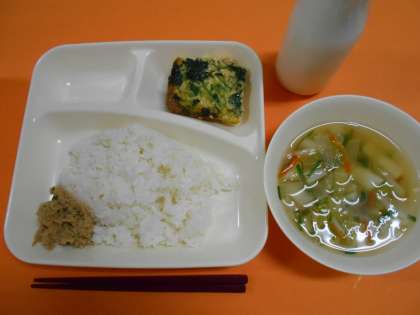 千草焼き、すまし汁、ツナと三度豆のそぼろ、ごはん、牛乳